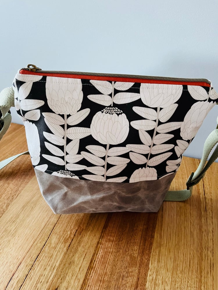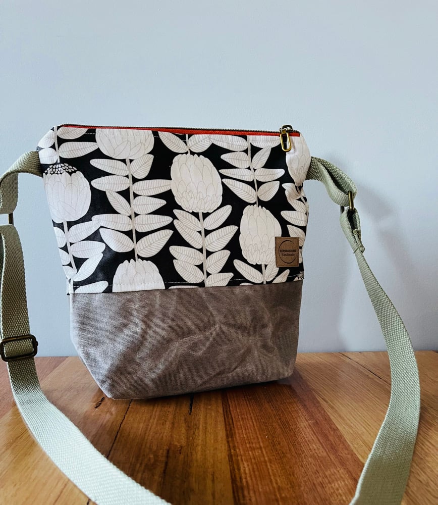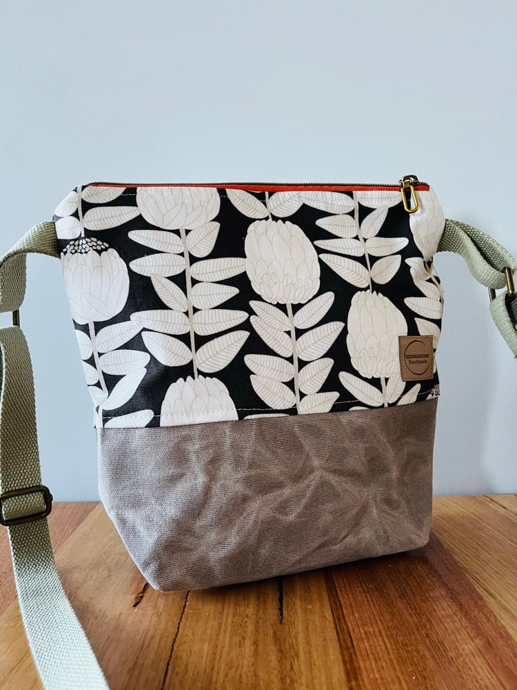 This shoulder bag is a new style for me. Adding a metal zipper to top of bag, very easy to undo and do up. It features a proteas on a cotton