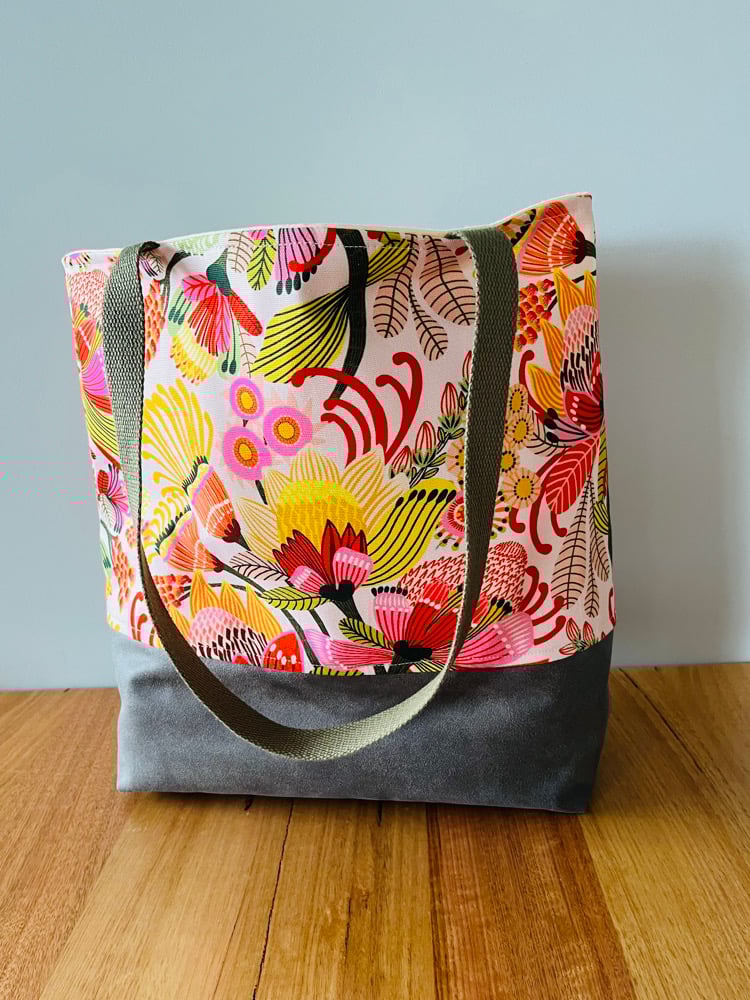 This tote is sewn in a cotton canvas fabric.
