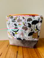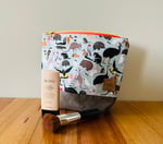 Fabric is cotton, and is designed by Tasmanian designer Red Parka , lined with calico. Note colour of matching zipper is orange and yellow. Bottom of bag is a grey suede leatherette, giving bag more structure and base of bag extra protection. Pouch is also lined with interfacing to add extra structure.