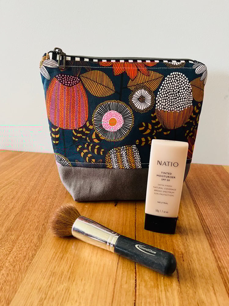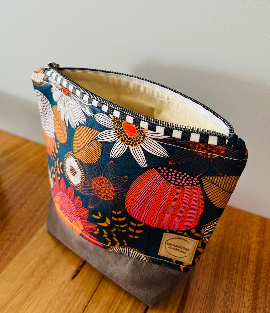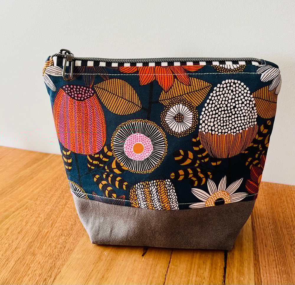 Bottom of bag is a grey suede leatherette, giving bag more structure and base of bag extra protection. Pouch is also lined with interfacing to add extra structure.