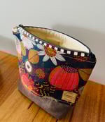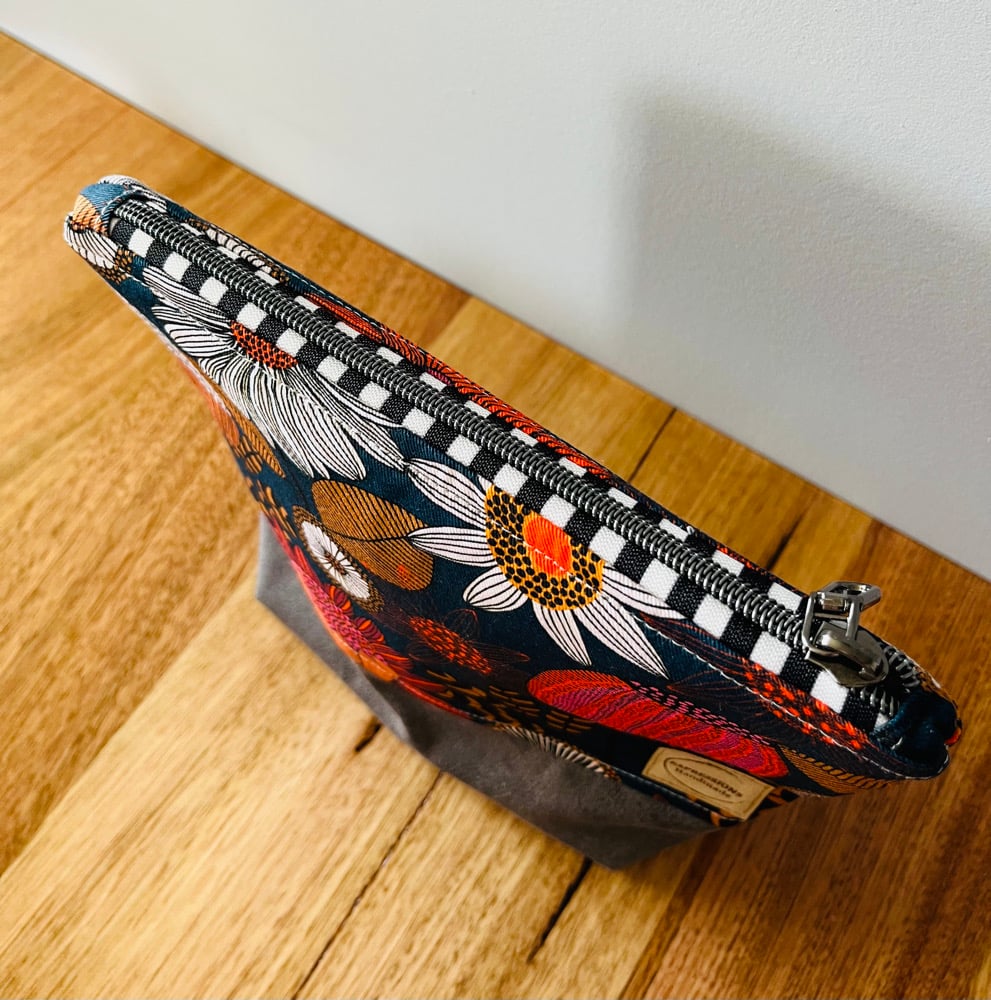 Fabric is a cotton drill, and is designed Jocelyn Proust , lined with calico. Note colour of matching zipper is black and white check, giving an extra ‘hit of colour’ to the whole look of zipper.