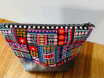 Fabric is a cotton, and is designed Jocelyn Proust , lined with calico. Note colour of matching zipper is black and white check, giving an extra ‘hit of colour’ to the whole look of zipper.