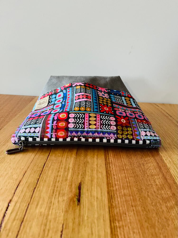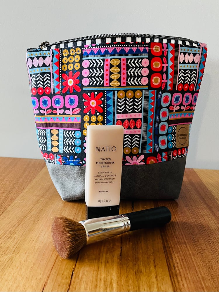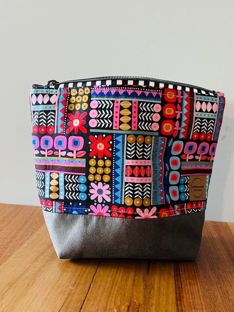 Bottom of bag is a grey suede leatherette, giving bag more structure and base of bag extra protection. Pouch is also lined with interfacing to add extra structure.