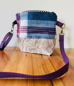 Lined with calico and two inside pockets. The adjustable strap is a purple cotton webbing, strong and sturdy and is fitted with two 2 clips, that remove strap from bag.