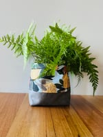 Bag is lined with same outer fabric, and bottom of bag is hessian for extra protection if using as a potplant bag. Interfacing is used for extra structure and outer fabric on the bottom of bag is a brushed suede leatherette.