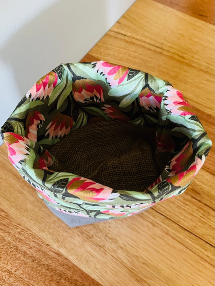Bag is lined with same outer fabric, and bottom of bag is hessian for extra protection if using as a potplant bag. Interfacing is used for extra structure and outer fabric on the bottom of bag is a brushed suede leatherette.